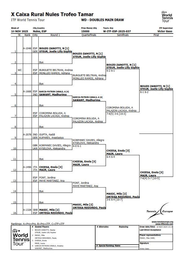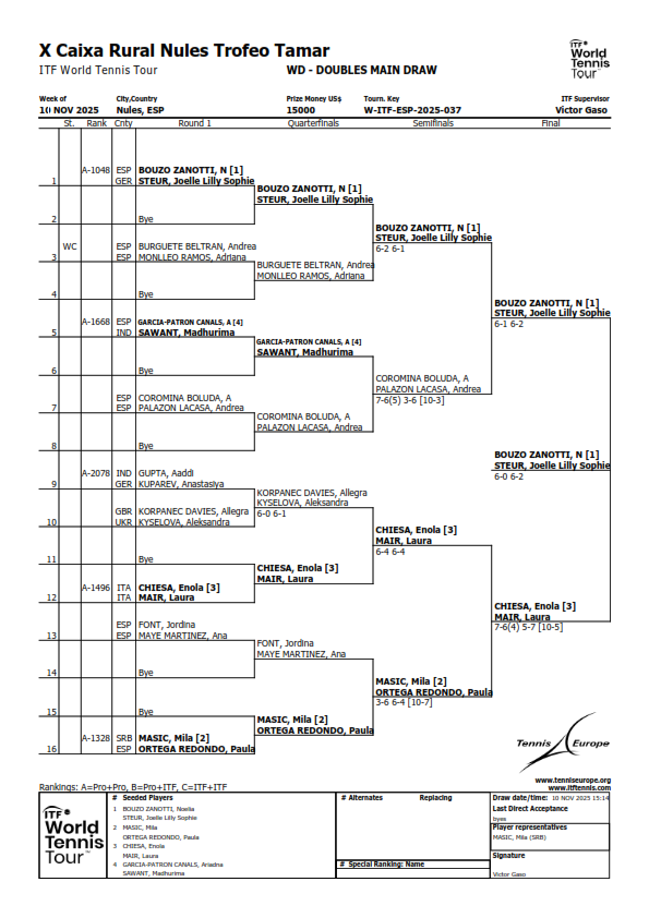 Puntualmente a las 15,00h, arrancaba la primera gran final de este X OPEN INTERNACIONAL DE TENIS FEMENINO CAIXA RURAL NULES -I TROFEO TAMAR-, en la modalidad de dobles. Las dos parejas aspirantes al título, Bouzó-Steur y Mair-Chiesa, se enfrentaron en un emocionante partido en la pista central. La pareja Bouzó-Steur hicieron valer su condición de primeras cabezas de serie y se impusieron por 6/0 6/2 en 47 minutos de juego, proclamándose así campeonas de esta edición