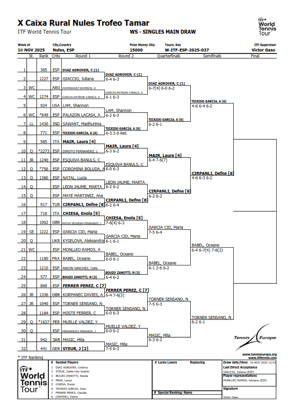 Durante la jornada del Jueves 13 de Noviembre se celebraron los octavos de final del I OPEN INTERNACIONAL DE TENIS FEMENINO CAIXA RURAL NULES -I TROFEO TAMAR-, con partidos de muy alto nivel. La castellonense y tercera cabeza de serie Noelia Bouzó, no pudo superar a la francesa Babel en el partido de segunda, viéndose superada en tres sets por 6/1 2/6 6/2 a favor de la jugadora francesa. También en tres sets, consiguió avanzar ronda la principal favorita, la española Cristina Díaz, tras imponerse a la también española García-Patrón por 6/7 6/0 6/2.