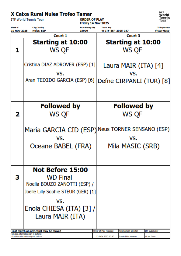 Para la jornada del Sábado 15, está programadas las dos semifinales a las 11,30h, donde las jugadoras lucharán por un puesto en la final. La GRAN FINAL de este X OPEN INTERNACIONAL DE TENIS FEMENINO CAIXA RURAL NULES -I TROFEO TAMAR- se disputará en la pista central del club el DOMINGO 16 a las 10,45h, con entrada gratuita..