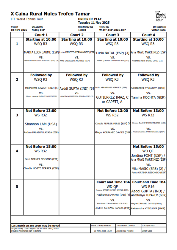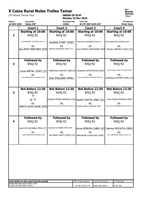 Las jugadoras españolas Judith Hernández, Cayetana Gutiérrez, Alba Coromina, Patricia Rodríguez, Luna Dinoto, Anna Cabassers, Ana Maye, Lucía Natal, Mar Quesada y Marta León, consiguieron avanzar a la ronda de clasificación prevista para la jornada del Martes. Destacar el gran ambiente en las pistas nulenses durante toda la jornada, en la que ya se vieron entrenar a los principales favoritas al título. Para la jornada del Martes 11, están programados los partidos de clasificación al cuadro final, a partir de la 10,00, así como algunos partidos del cuadro principal. Entre otras, debutarán en el cuadro final las españolas Claudia Ferrer, séptima cabeza de serie, en el tercer turno, así como Ariadna García-Patron y el partido entre españolas Neus Torner y Claudia Hoste, en el tercer y cuarto turno respectivamente. De la misma forma, arrancará también el cuadro de dobles con partidos a partir del cuarto turno (no antes de las 13,00h), en el que debutarán varias de las jugadoras españolas. Una jornada emocionante y repleta de partidos para este Martes y con entrada totalmente gratuita.