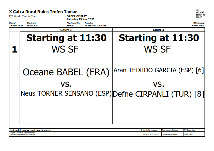 La jornada del Sábado 15 arrancó puntualmente a las 11,30h con la dos semifinales previstas, entre la española Neus Torner y la francesa Oceane Babel y entre la española Aran Teixidó y la turca Defne Cirpanli. El primero de ellos, tuvo puntos de muy alto nivel y algo más de 2 horas de juego, decantándose por la jugadora francesa con resultado de 1/6 6/1 6/3. La otra otra semifinal, cayó a manos de la jugadora española Teixidó en dos sets por 6/3 6/1, con puntos de alta intensidad durante todo el partido.