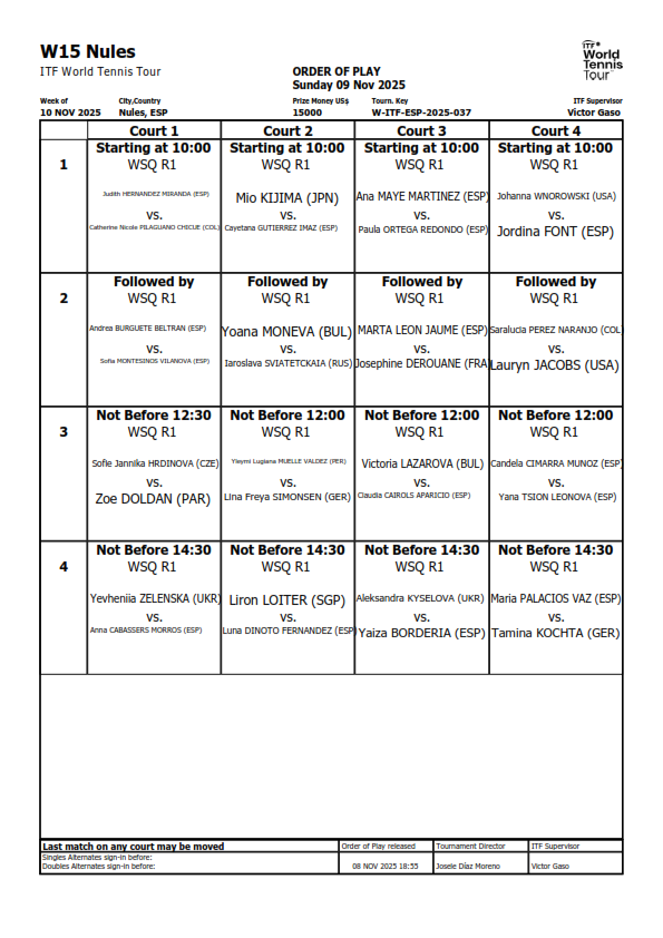 La jornada se abrió con el partido del primer turno de pista central con la castellonense Noelia Bouzó, tercera cabeza de serie, ante la también española Celia Ansón, con victoria de Noelia por 6/4 6/2. Ya en el segundo turno, hizo el debut la jugadora local Adriana Monlleó que se vió superada por la francesa Oceane Babel, destacando su mayor experiencia, por 6/0 6/1. También consiguieron avanzar ronda las favoritas Cristina Díaz (1), Laura Mair (4), Enola Chiesa (5), Aran Teixidó (6) y Defne Cirpanli (8), quedando eliminada la segunda favorita y campeona en la semana pasada en el ITF de Castellón, Steur, ante la serbia Mila Masic por 7/5 6/2.