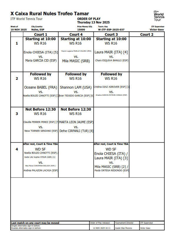 Para la jornada del Jueves 13, se prevén emocionantes partidos, tanto de octavos de final del cuadro principal, como de semifinales en el cuadro de dobles. Los partidos se disputarán a partir de las 10,00h en las pistas del SCUDE-NULES, con entrada totalmente gratuita. Asimismo, recordamos que la final de dobles se disputará durante la jornada del Viernes y la final principal será el Domingo a las 10:30h.