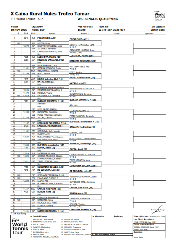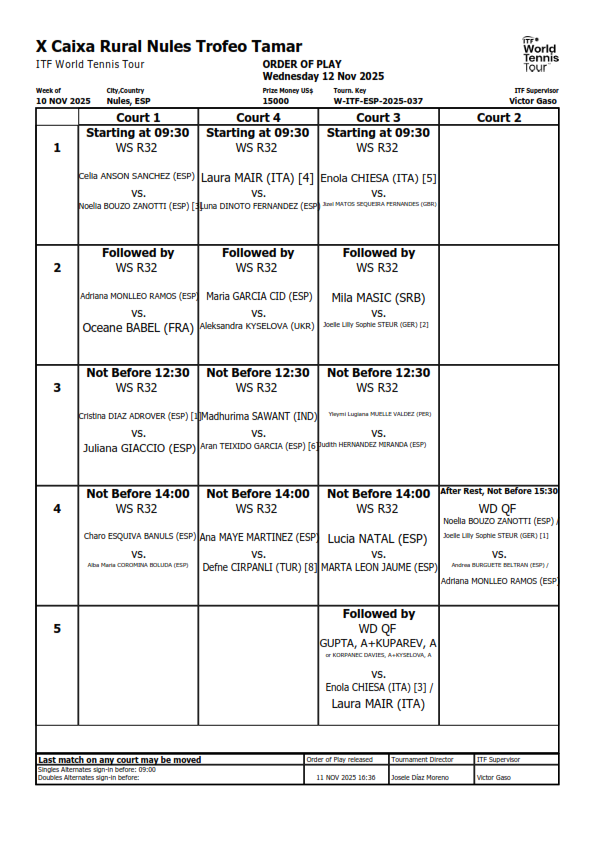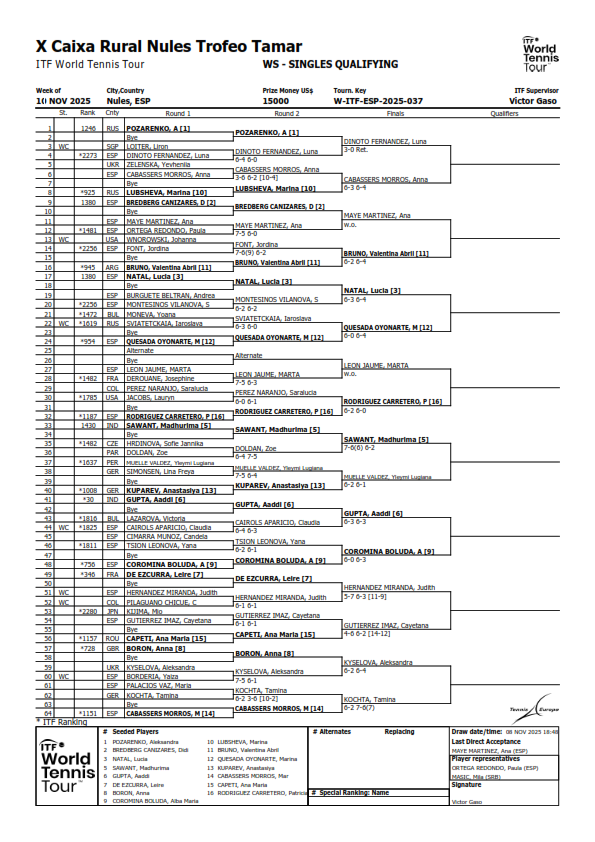 Respecto al cuadro de dobles, que también dio comienzo este Martes, las parejas Paula Ortega-M.Masic, segundas cabezas de serie, ganaron en el match tie-break por 3-6 6-4 10-7. También avanzó la pareja española Alba Mª Coromina-Andrea Palazón por 7-6 6-3 10-3.