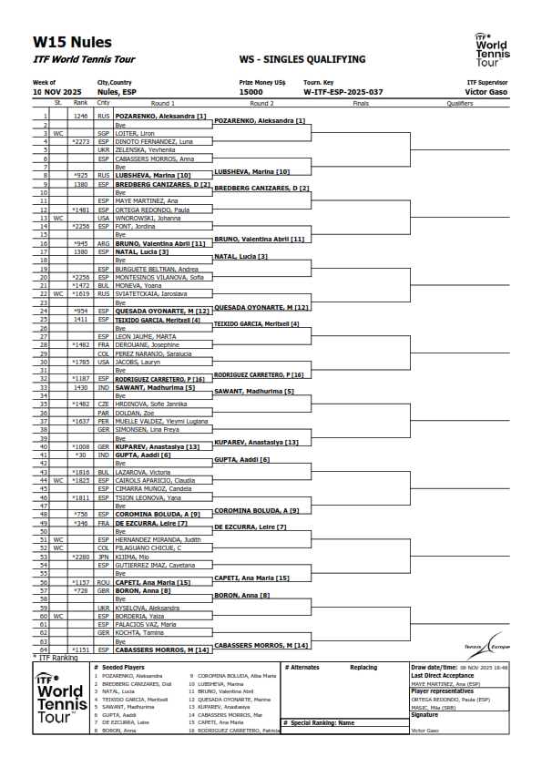 Asimismo, la única cabeza de serie del cuadro final que entró en liza, la español Claudia Ferrera (7), consiguió avanza a segunda ronda superando a la inglesa Korpanec por 6/4 7/5. El resto de cabezas de serie, se darán cita en el órden de juego del Miércoles. La castellonene y tercera cabeza de serie, Noelia Bouzó, debutará en el partido inaugural de la pista central. A continuación, lo hará la local Adriana Monlleó en el segundo turno frente a la francesa Oceane Babel.