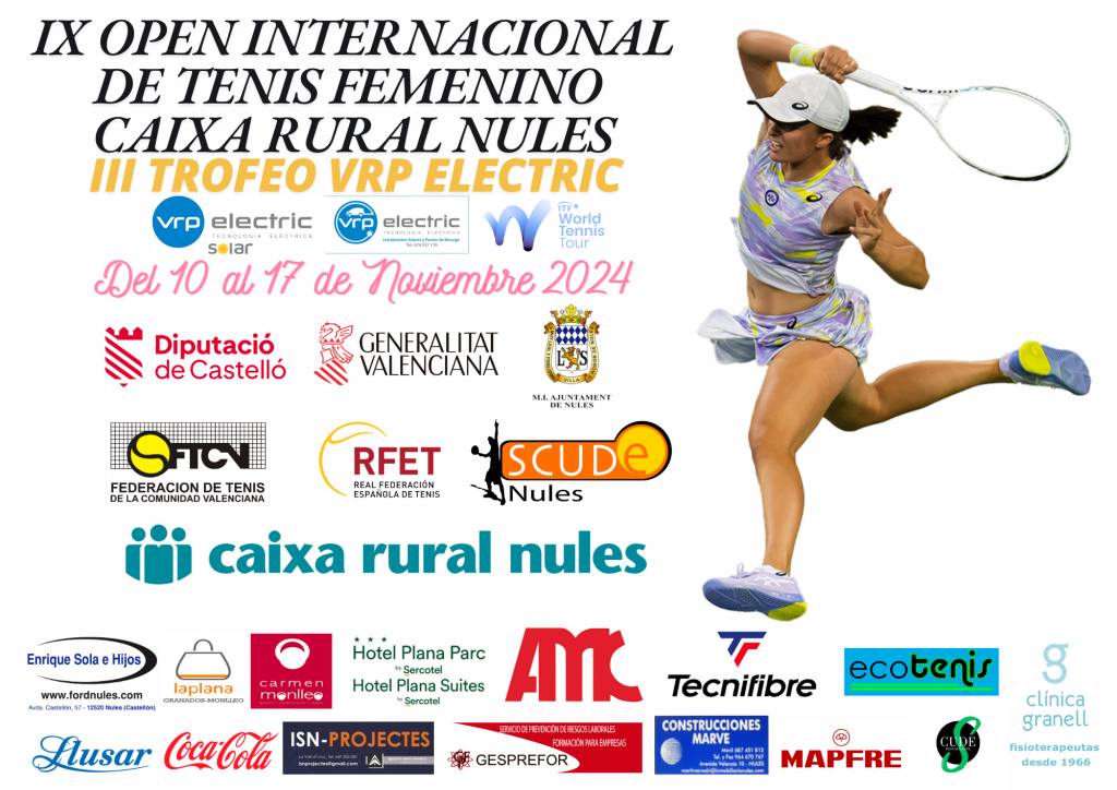A partir del próximo Domingo 10 de Noviembre 2024 dará comienzo el gran torneo 15,000$: IX OPEN INTERNACIONAL DE TENIS FEMENINO WTA CAIXA RURAL NULES -III TROFEO VRP ELECTRIC- con la presencia de las mejores jugadoras y promesas del panorama tenístico internacional. Desde el Sábado 9 de Noviembre ya se podrán ver a las primeras jugadoras en nuestro club, donde tendrá lugar la firma y sorteo de partidos de la fase previa.