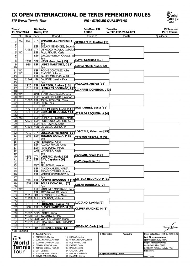 Ya está todo listo para el inicio del gran torneo 15,000$ IX OPEN INTERNACIONAL DE TENIS FEMENINO CAIXA RURAL NULES -III TROFEO VRP ELECTRIC-, en las instalaciones de SCUDE-NULES, que se disputará a partir de mañana Domingo 10 y hasta el Domingo 17, día de la gran final. En esta octava edición de este importante torneo internacional femenino dentro del calendario WTA, jugadoras de diferentes países confirmaron su participación en la fase previa del torneo acudiendo a la firma que tuvo lugar durante la tarde del Sábado. A la conclusión de dicha firma, se realizó el sorteo de la fase previa, a manos del juez árbitro del torneo, Pere Torras.